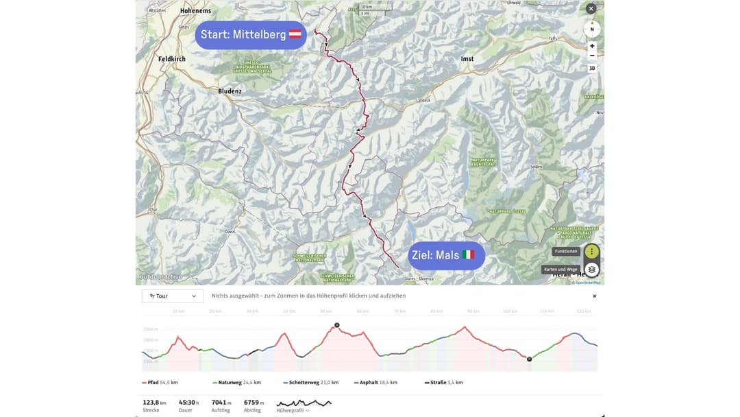 Wir starten kurz hinter Oberstdorf in Mittelberg (Österreich) und laufen über die Schweiz an unseren Zielort Mals in Italien: